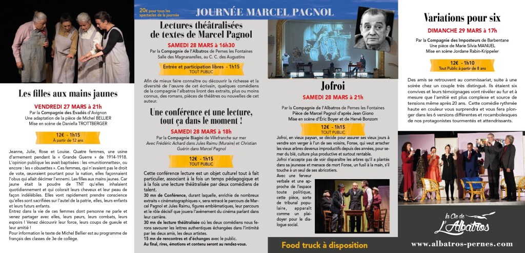 En route pour le 14e Festiv’Albatros ! 16 mars 2026ActusCompagnie l'Albatros Pernes Voici le nouveau, tout beau, tout chaud, programme du 14e Festiv’Albatros qui aura lieu du 27 au 29 mars 2026. Au plaisir de vous y rencontrer ! Partager: Partager sur X(ouvre dans une nouvelle fenêtre) X Partager sur Facebook(ouvre dans une nouvelle fenêtre) Facebook J’aime chargement… Similaire